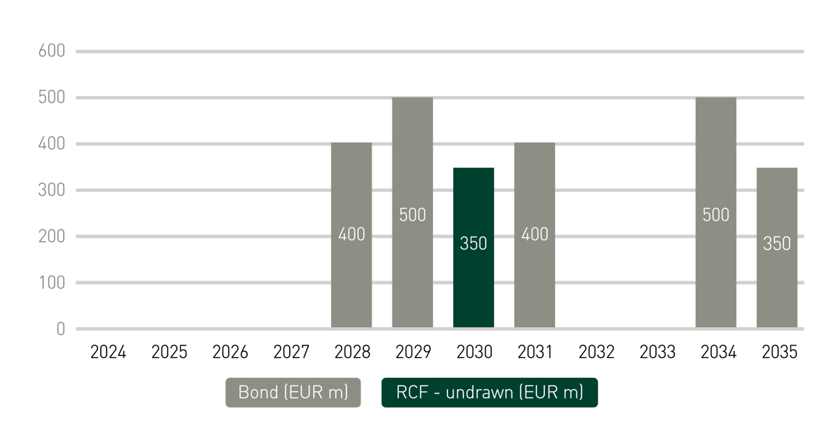 In addition to its own liquidity, Mölnlycke has a syndicated multi-currency revolving credit facility of EUR 350 million (unutilised). It was signed in 2023 as a 5+1+1 agreement. Mölnlycke has chosen to execute both the extension options in 2024 and 2025. Final maturity date is 2030. The facility is backed by a group of seven leading global and regional banks, well diversified to match Mölnlycke’s geographical footprint. The banks are BNP, Danske Bank, HSBC, ING, JP Morgan, Nordea and SEB.