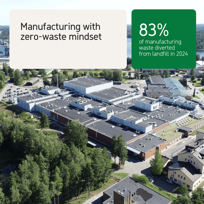 We work continuously to optimise processes in order to meet our near-term target of zero manufacturing waste to landfill by 2030. This includes diverting waste from landfill through practices such as reuse and recycling (39% of waste in 2024) or through sending waste to incineration with energy recovery (44% of waste in 2024).
