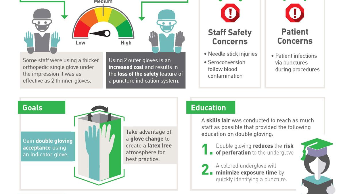 Nach der Einführung wurde in allen Bereichen mit Ausnahme des Herzchirurgieteams ein 100%iger Einsatz der doppelten Handschuhe festgestellt. Die Zahl der Nadelstichverletzungen ging im ersten Jahr nach der Einführung um 31 % zurück. Der OP konsolidierte die Produktnutzung, rechnete mit einer Kostenreduzierung von ca. 43.000 USD bei den Handschuhausgaben und profitierte klinisch von einer Atmosphäre ohne Naturkautschuklatex.1