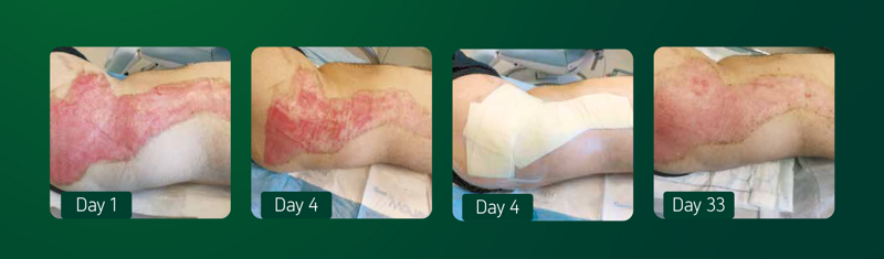 A 39-year old male presented at the clinic with a second-degree burn resulting from contact with a wood-burning stove. The patient had no ongoing co-morbidities or medication/therapy that could have affected the wound.