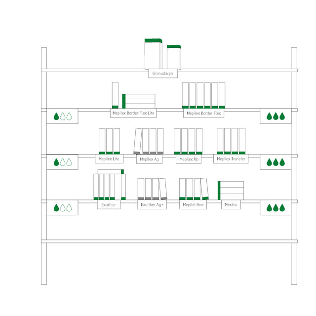 Som en del av vår förrådsservice kommer vi till ditt företag och skapar en välorganiserad struktur för dina sårbehandlingsprodukter. Detta koncept ger dig en tydlig översikt över alla produkter och gör det enkelt att hitta rätt produkt när du behöver den..
